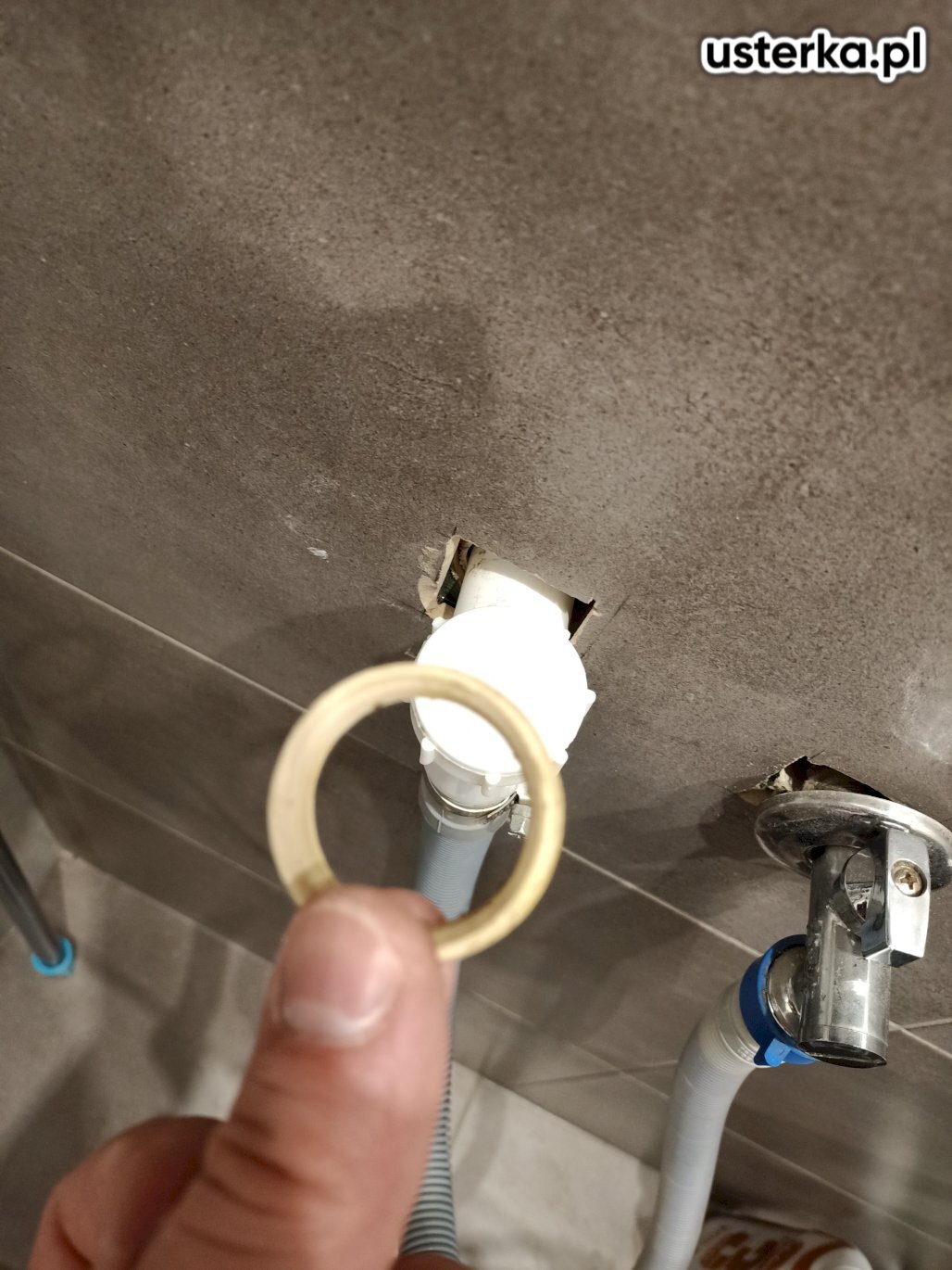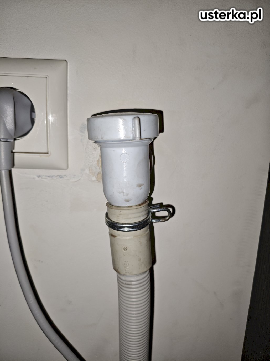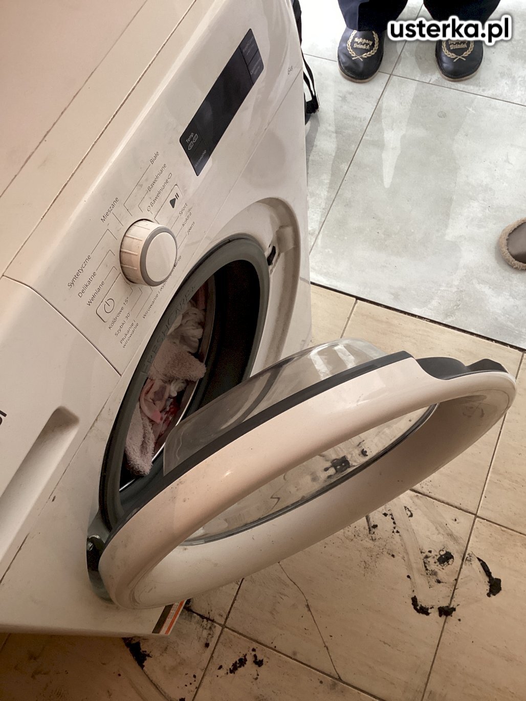 Przyczyną wycieku była uszkodzona uszczelka w odpływie w ścianie, który jest niestabilny i wymaga naprawy. Woda gromadzi się między zabudową a płytkami; zalecam zdjęcie płytki i osuszenie ściany. Pralka działa prawidłowo i nie przecieka.