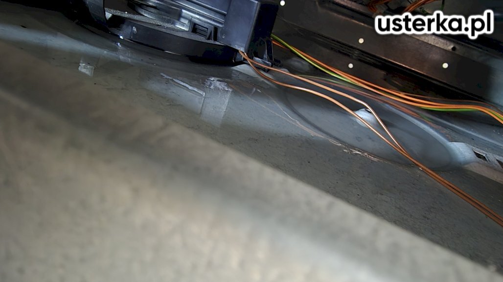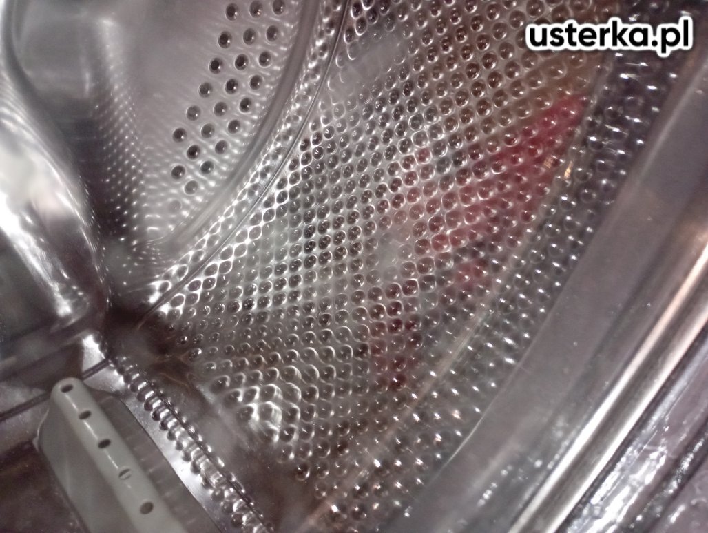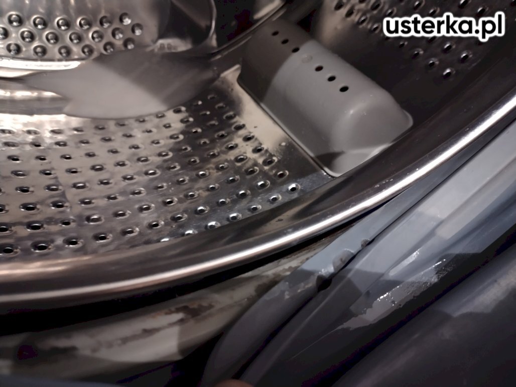 Zdiagnozowano wyrwaną rurkę podciśnienia bębna oraz wyciek wody na dnie pralki. Wyciek został usunięty, a rurka podciśnienia zamontowana na nowo. Przyczyną usterki było nieprawidłowe ułożenie pościeli w bębnie, co spowodowało nadmierne wychylenia bębna i uszkodzenie rurki.