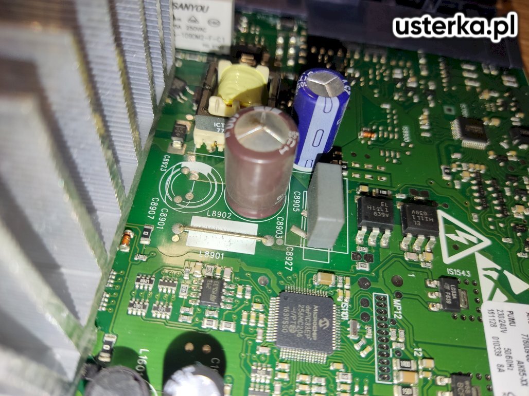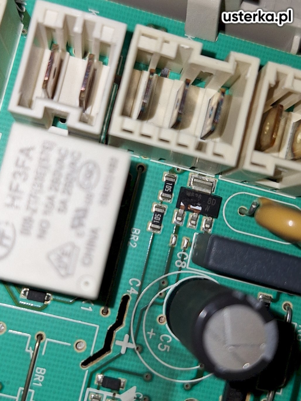 W pralce Bosch stwierdzono uszkodzenie kondensatora na płycie głównej, co uniemożliwia prawidłowe włączenie urządzenia.