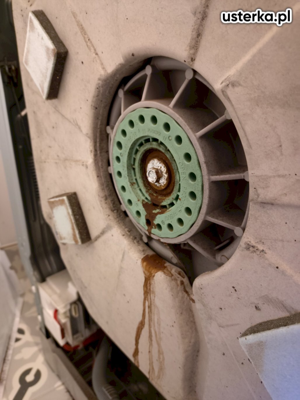 Po sprawdzeniu pralki stwierdzono wyciek oraz głośną pracę łożysk, które wymagają wymiany.