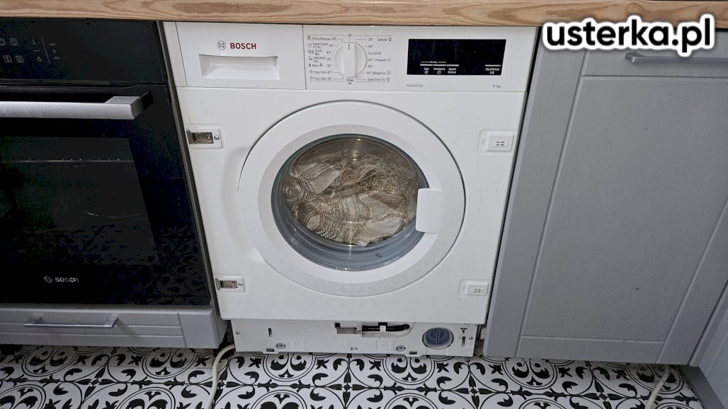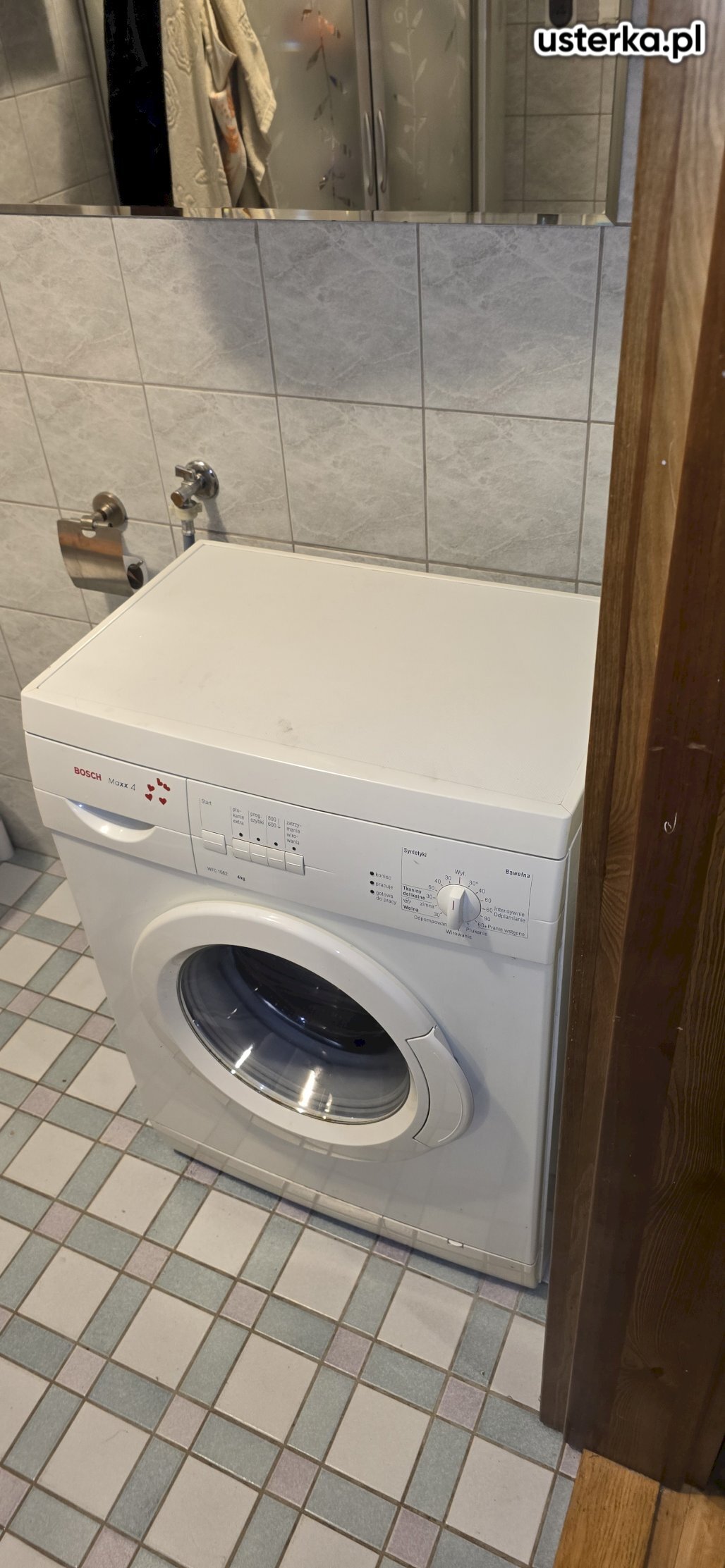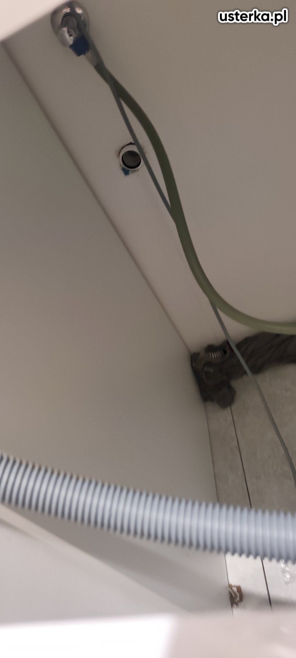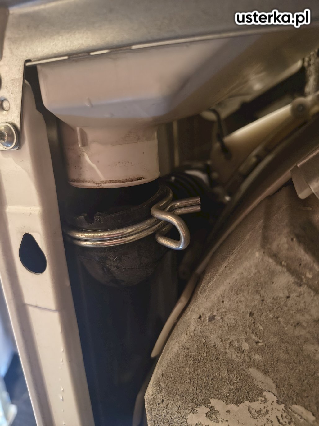 Pralka Bosch miała wyciek spowodowany wysunięciem węża między dozownikiem a bębnem. Wąż został poprawiony i zabezpieczony klamrą.