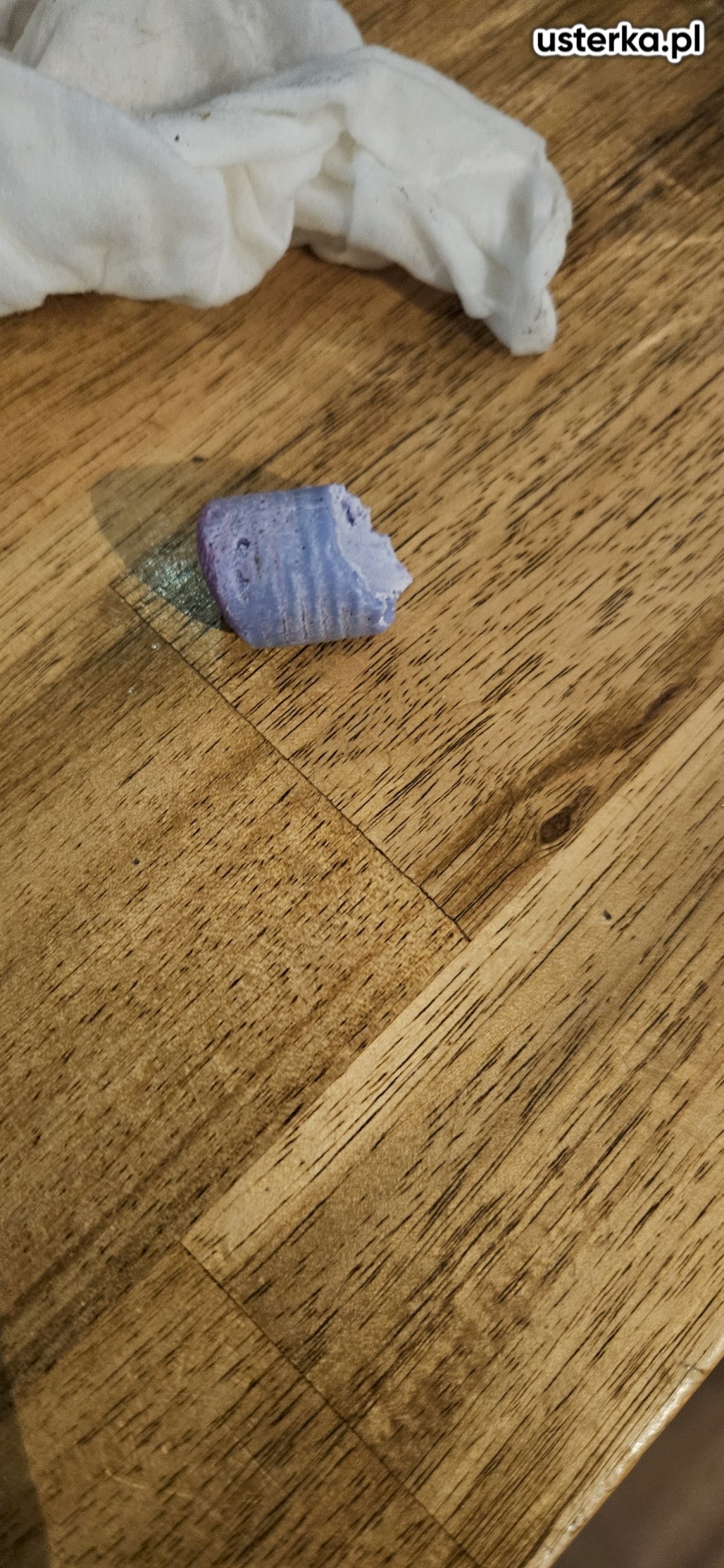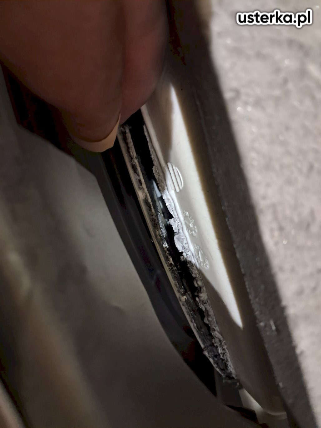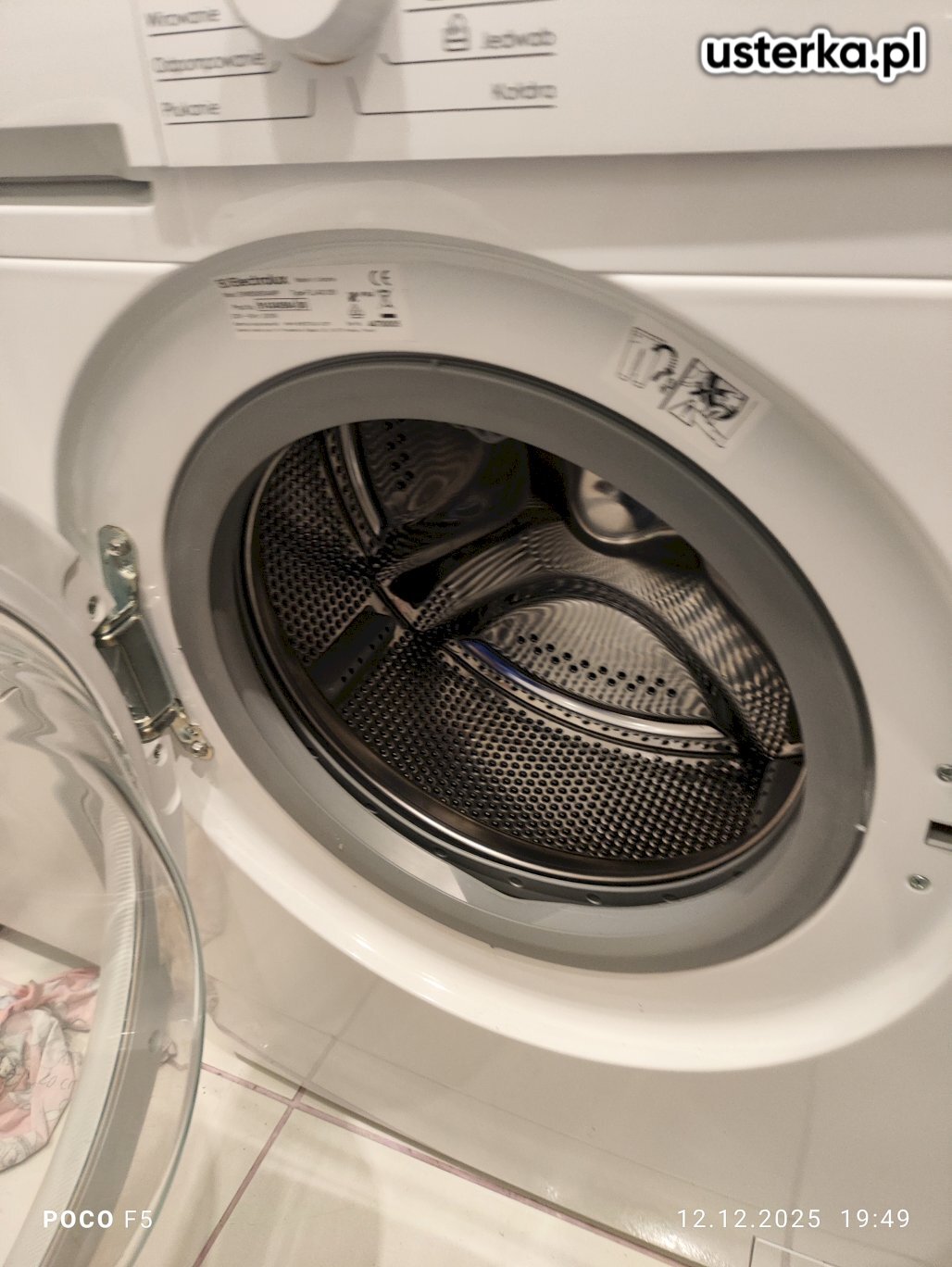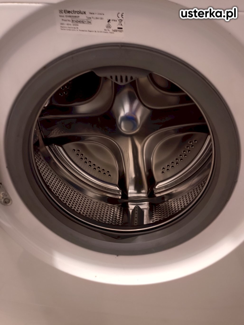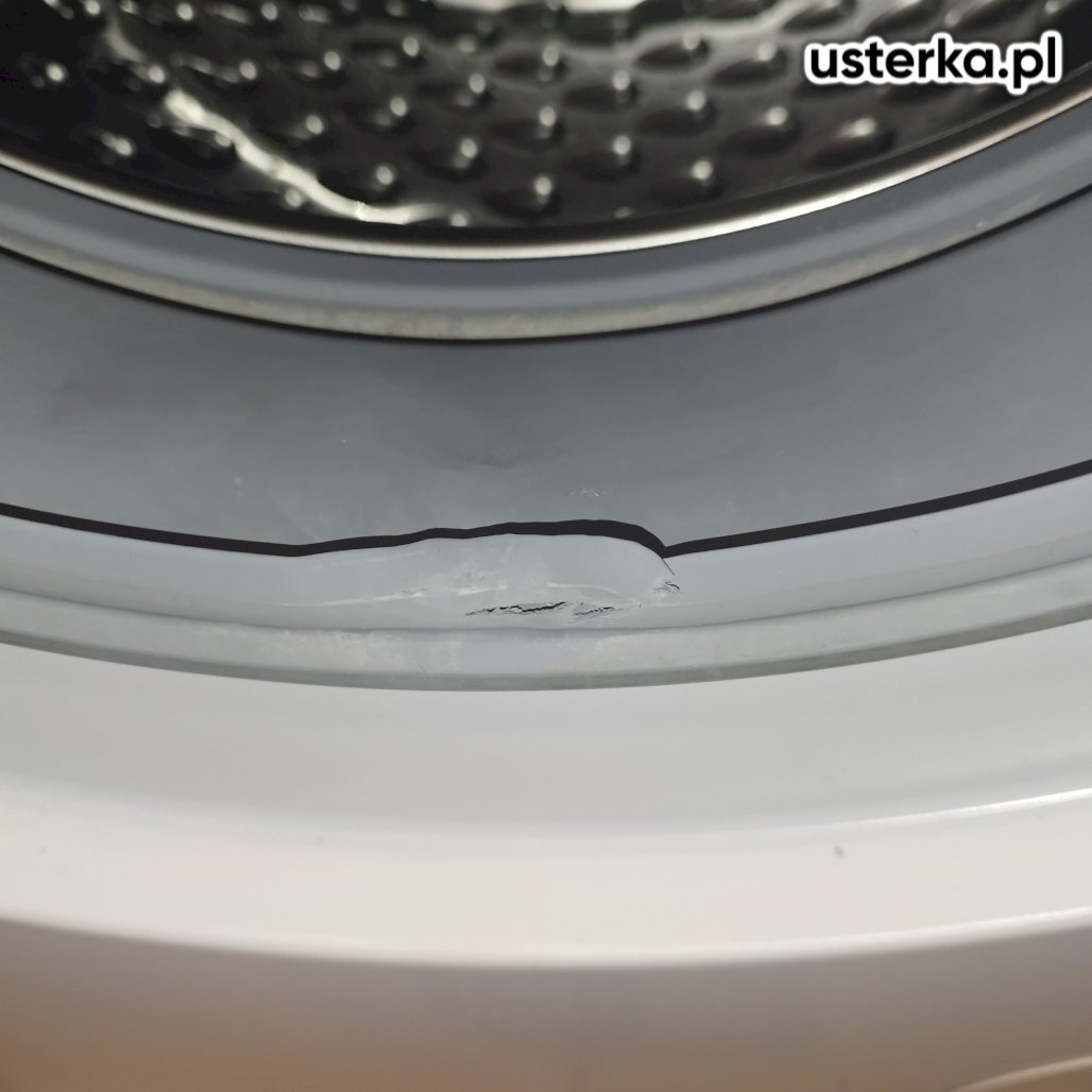 Z pralki zostały usunięte fiszbiny, które dostały się między bęben a wannę i uszkadzały ubrania. Po ich wyjęciu urządzenie działa prawidłowo. Zauważono niewielkie wykrzywienie bębna, o czym poinformowano klienta; obecnie nie wpływa to na pracę pralki.