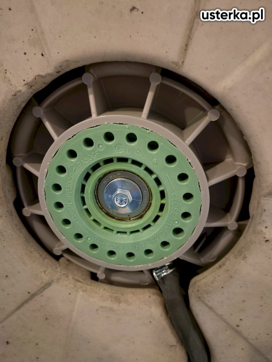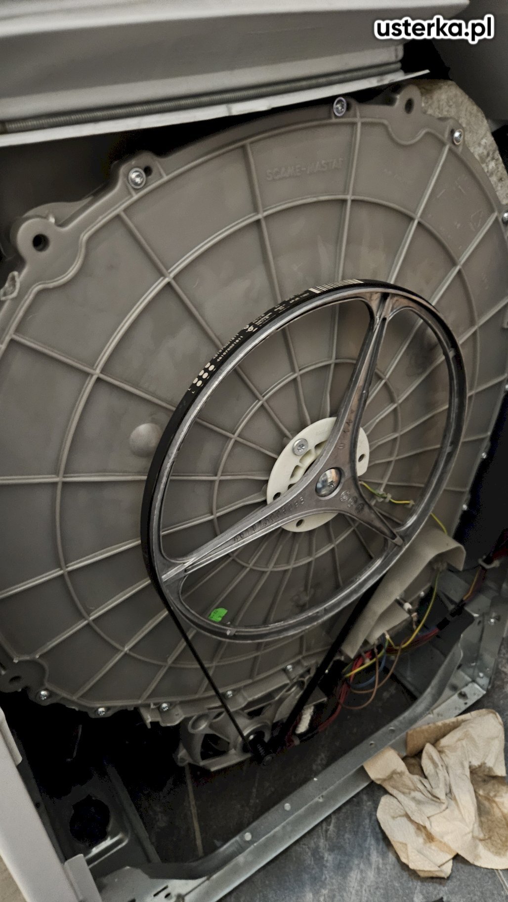 Odkręcona nakrętka mocująca koło pasowe została ponownie dokręcona z użyciem kleju do gwintów. Zamontowałem pasek napędowy. Pralka działa prawidłowo.