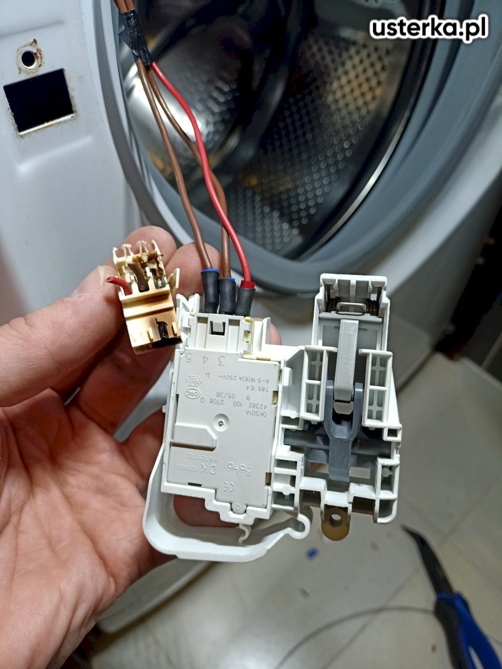 Wymieniłem uszkodzoną blokadę drzwi pralki na nową, przywracając jej pełną sprawność.