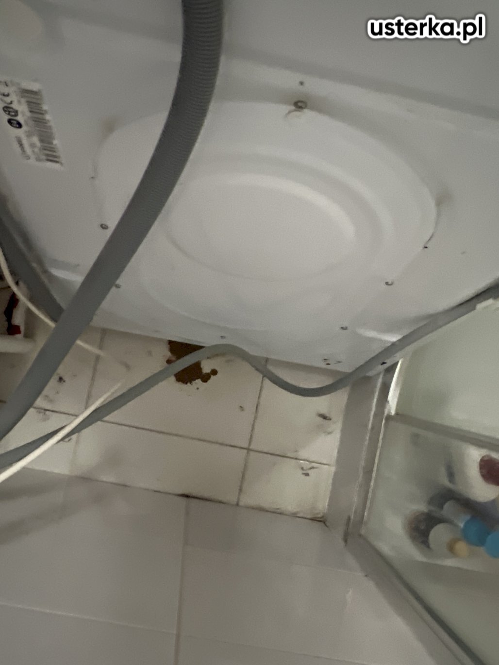 Przyczyną wycieku był zsunięty wężyk. Usunięto wodę ze spodu pralki i prawidłowo zamocowano wężyk.