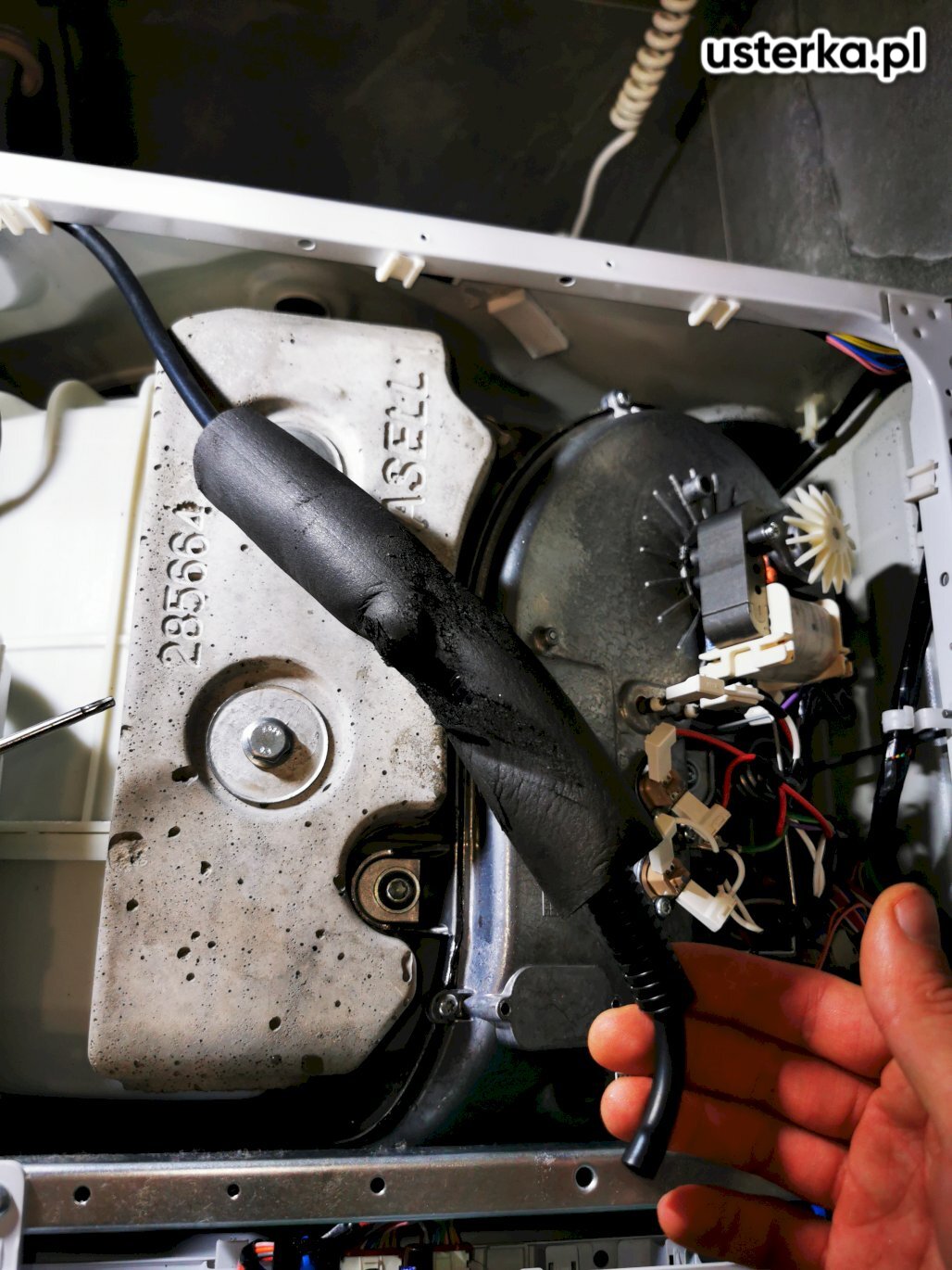 Sprawdzono pralkę – zidentyfikowano zablokowany filtr. Zdemontowano rurę między bębnem a pompą, usunięto zator (monety i inne przedmioty), następnie zamontowano wszystko z powrotem i przeprowadzono testy.