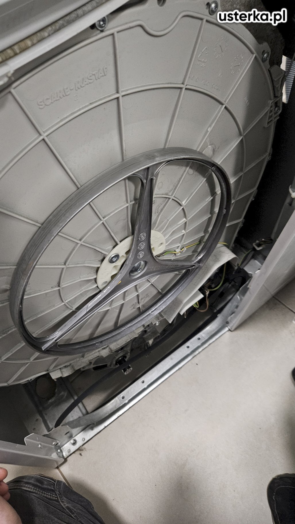 Zdiagnozowano spadek paska napędowego oraz przygięcie koła pasowego, które zostało naprawione. Sprawdzono pracę zespołu piorącego pod obciążeniem – wszystkie elementy, w tym amortyzatory i pompa odpływowa, działają prawidłowo.