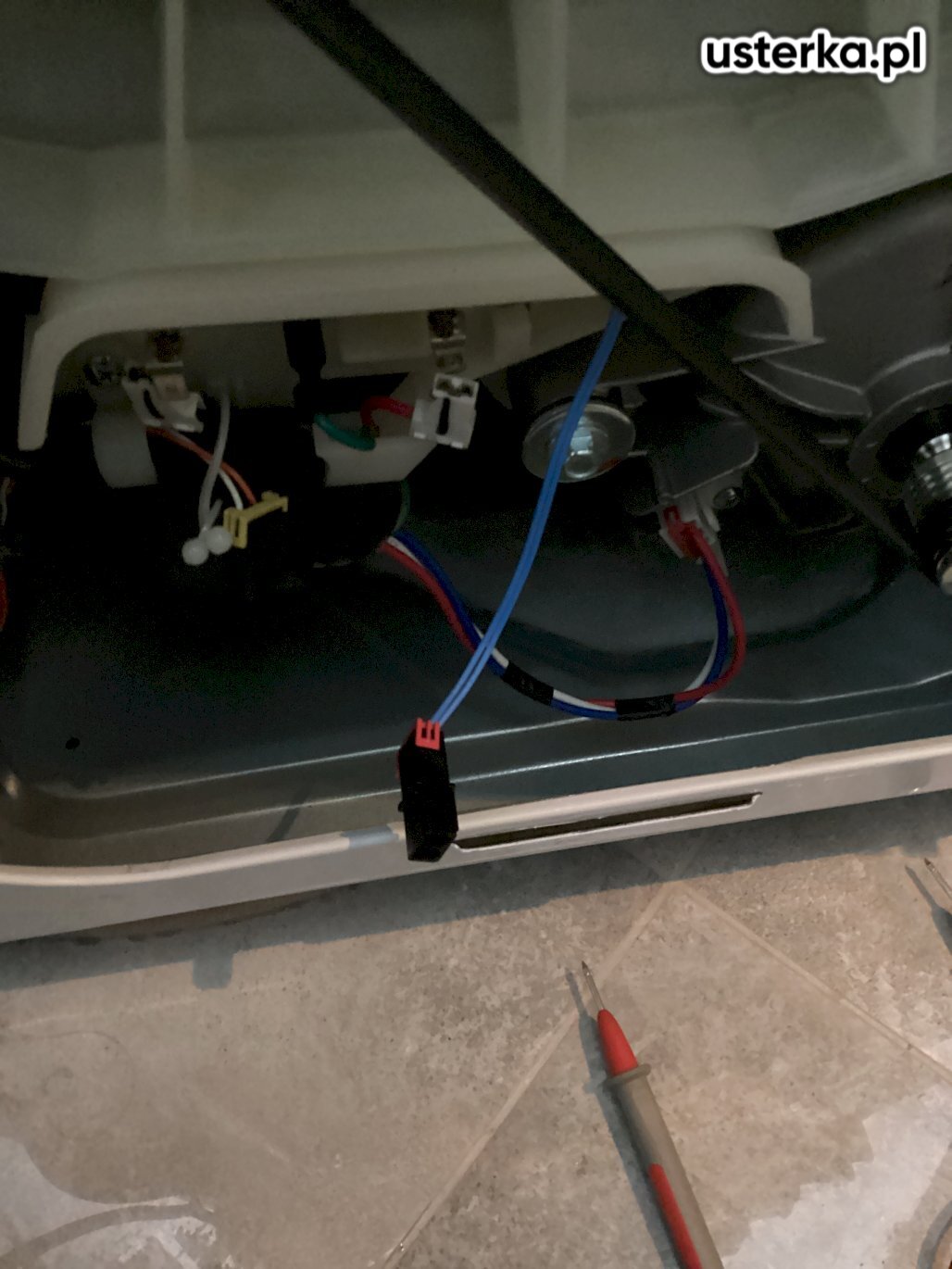 Wymieniłem końcówkę przewodu neutralnego, podłączyłem grzałkę oraz sprawdziłem działanie pompy odpływowej – pracuje prawidłowo. Pralka pobiera wodę i wykonuje pełny cykl pracy. Zamontowałem tylną i górną obudowę.