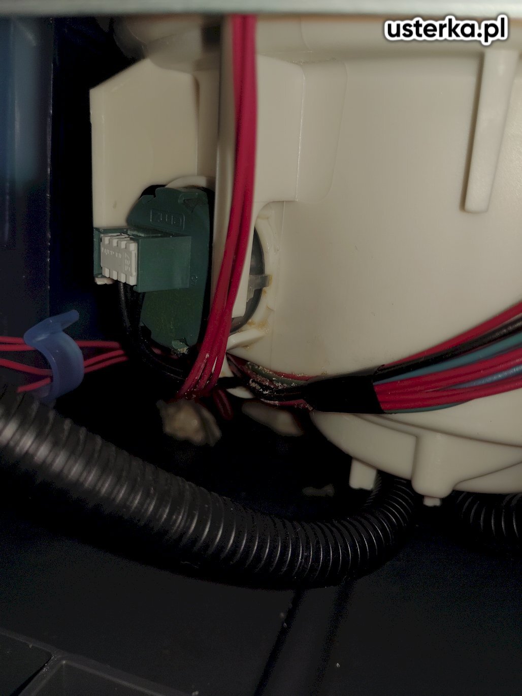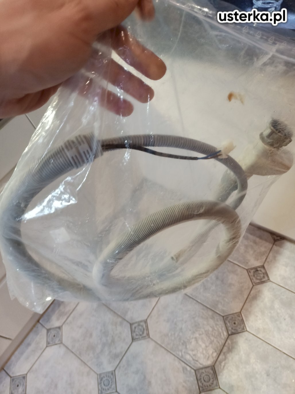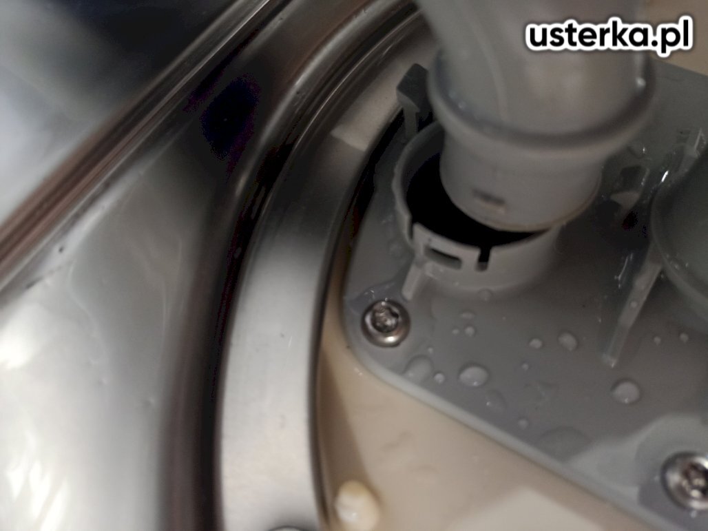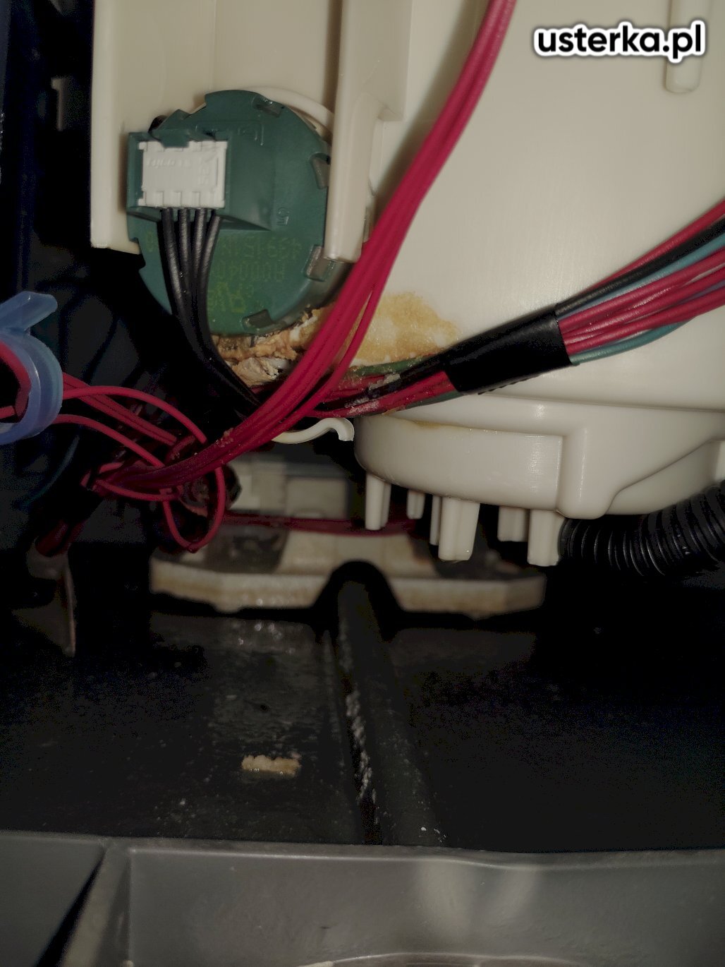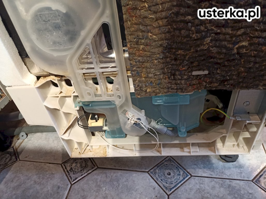 Wężyk doprowadzający wodę został poprawnie zamocowany, wycieki usunięte. Zalało zawór trójdrożny, zawór wody, pompę myjącą i grzałkę.