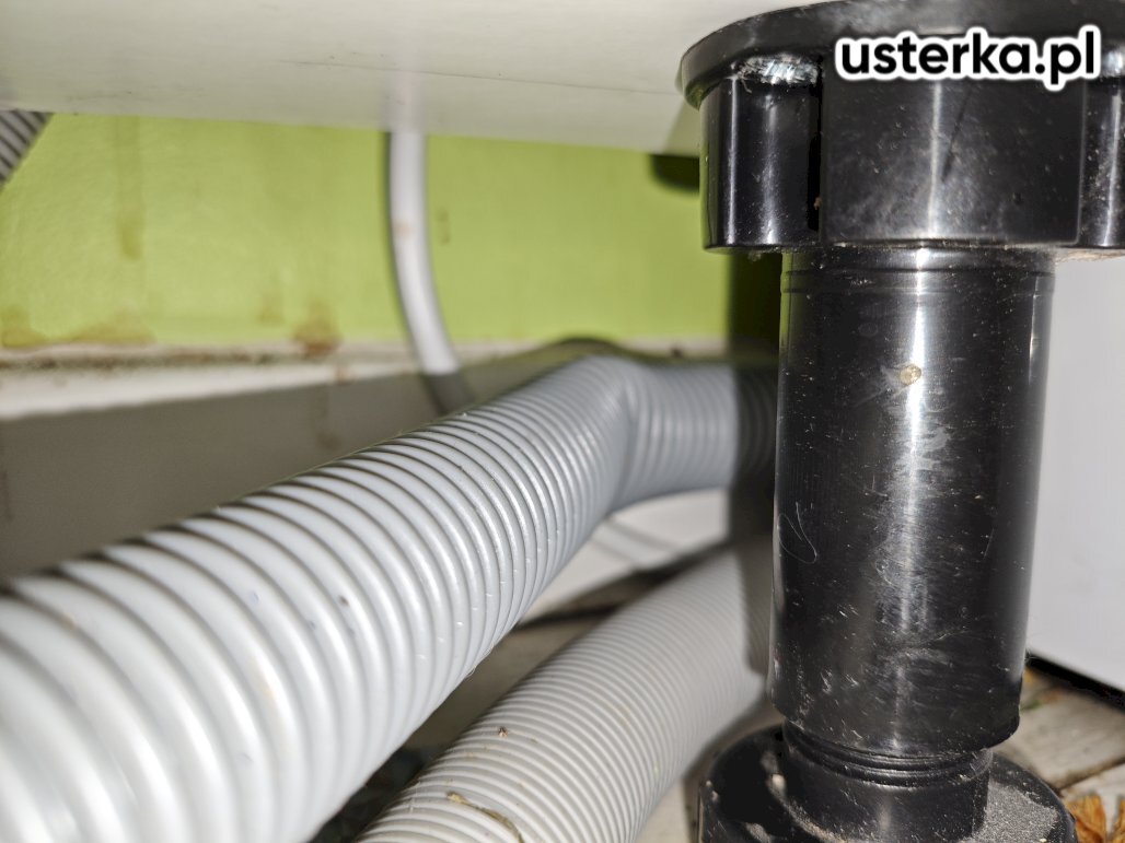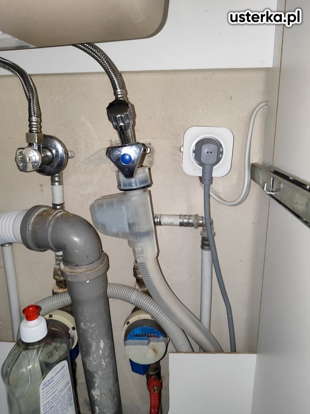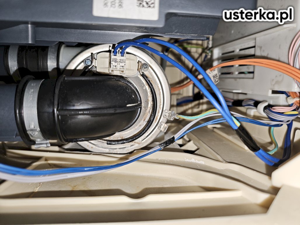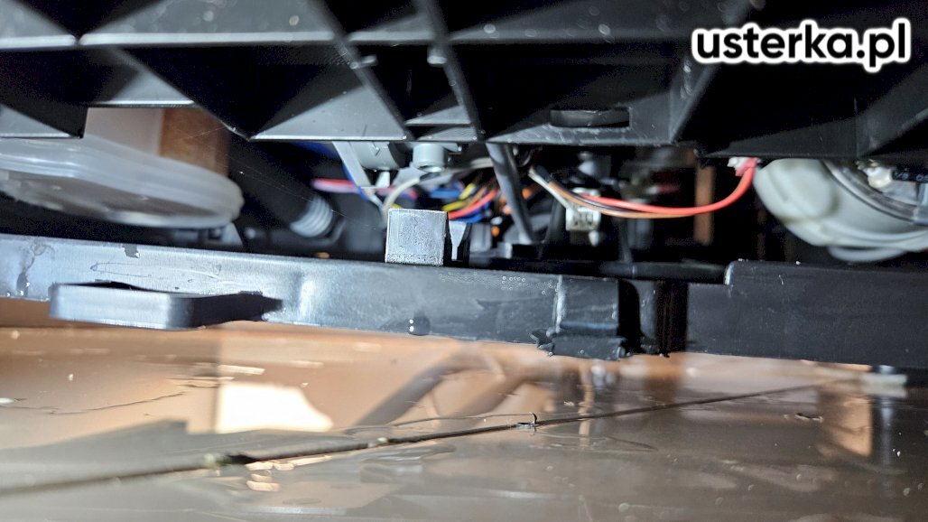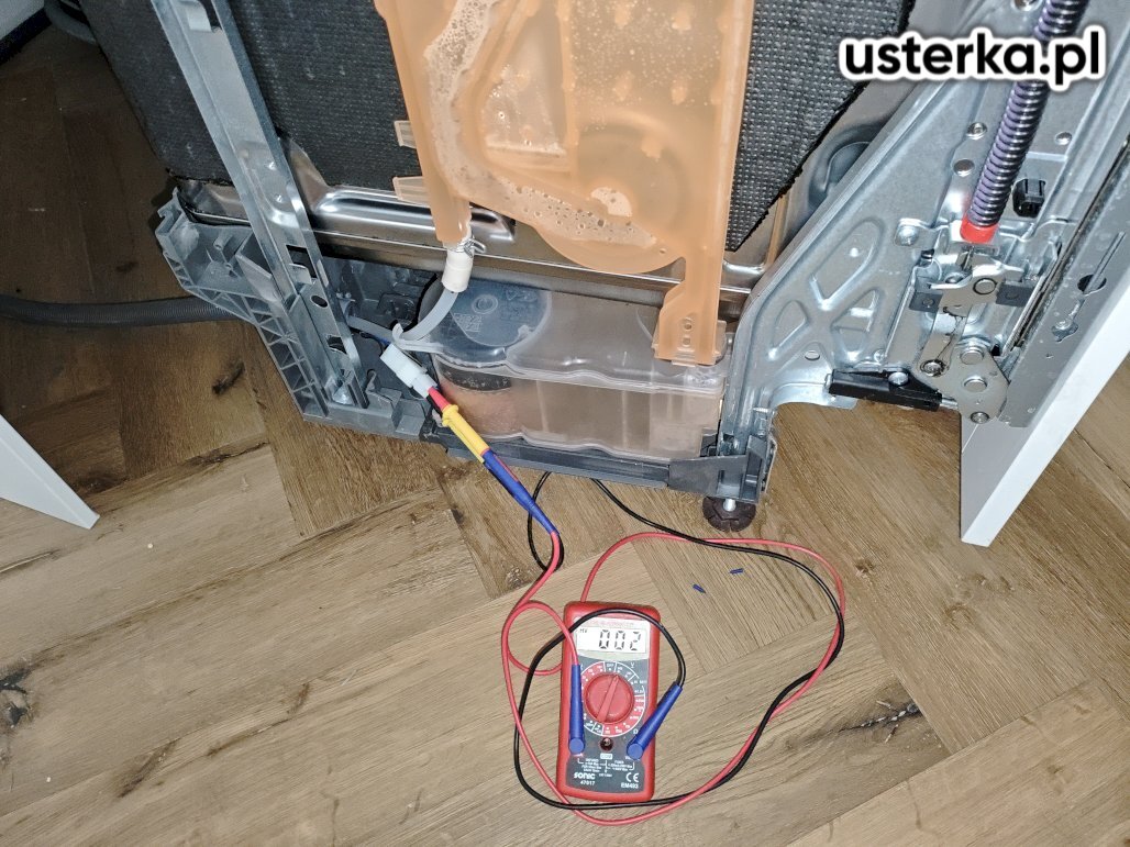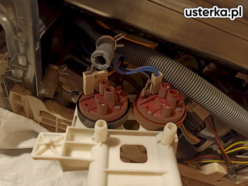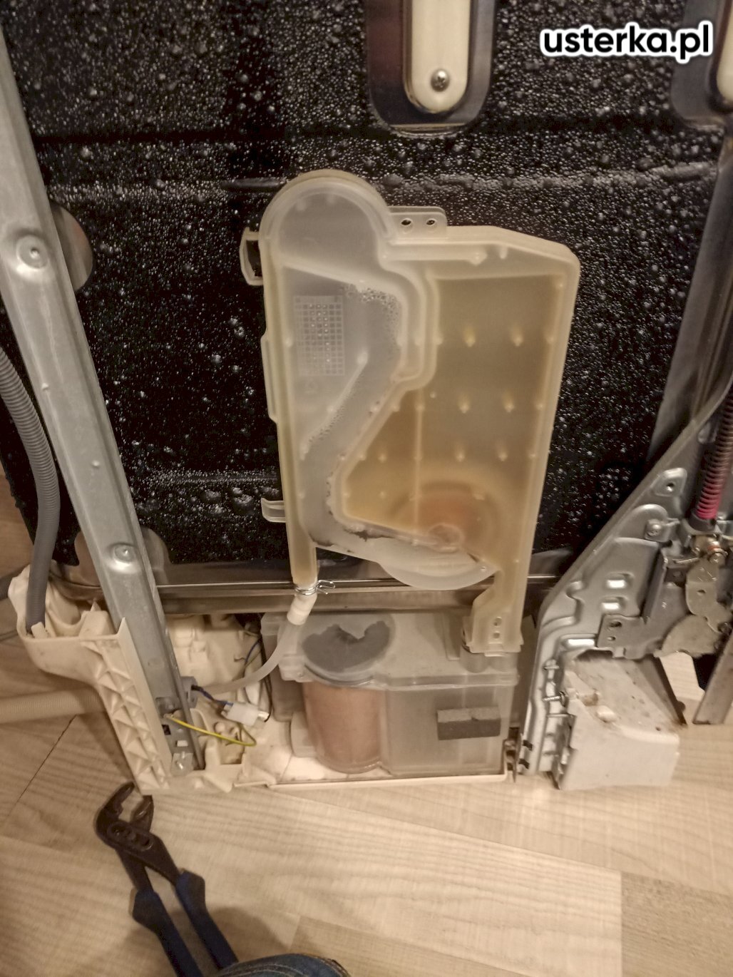 Wężyk doprowadzający wodę został poprawnie zamocowany, wycieki usunięte. Zalało zawór trójdrożny, zawór wody, pompę myjącą i grzałkę.