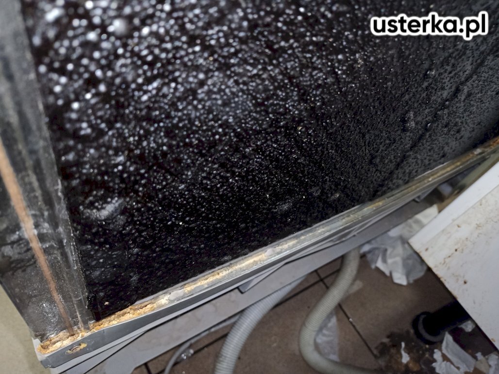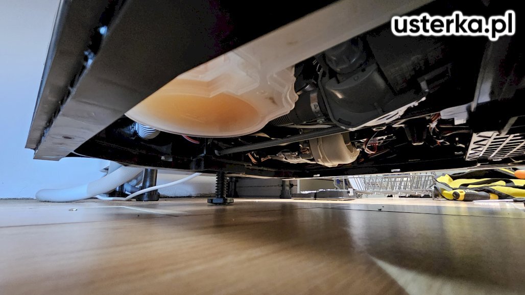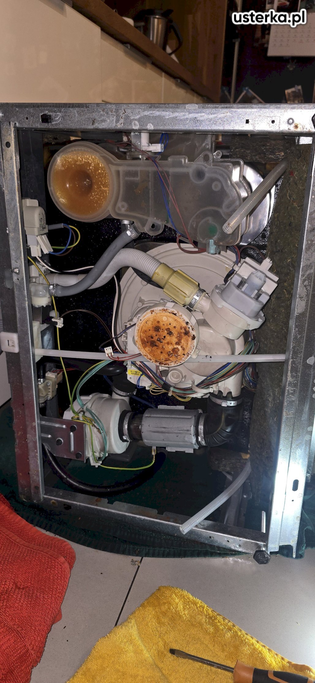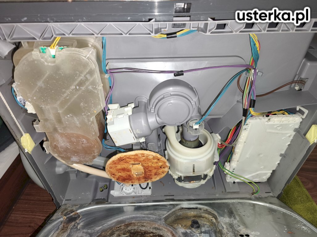 Demontaż zmywarki był utrudniony ze względu na zabudowę skręconą na wkręty. Przyczyną usterki był wyciek z pompy myjącej na wężu dopływowym. Poluzowaną pompę poprawiono, a po naprawie nie stwierdzono dalszych wycieków. Zmywarka została ponownie zamontowana w zabudowie.