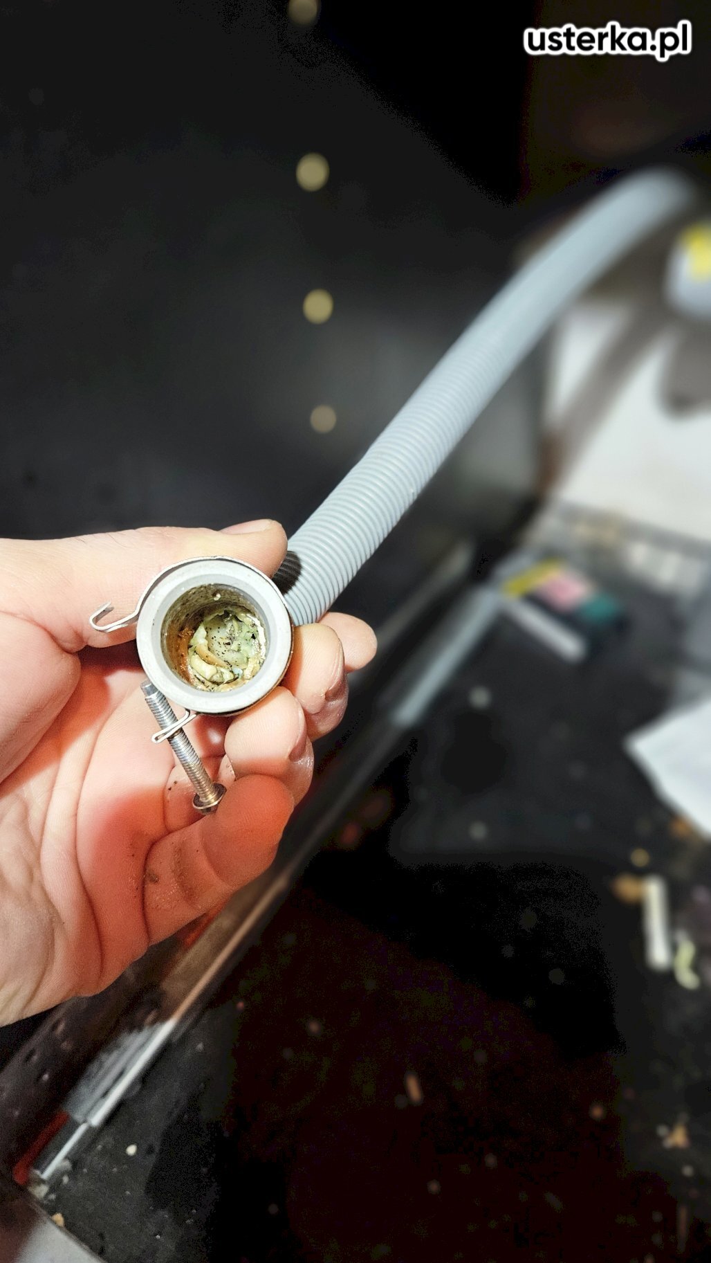 Zdiagnozowano niedrożność węża odpływowego przy syfonie, co uniemożliwiało prawidłową pracę zmywarki. Po usunięciu zanieczyszczeń urządzenie działa poprawnie, bez wycieków i problemów z odprowadzaniem wody.