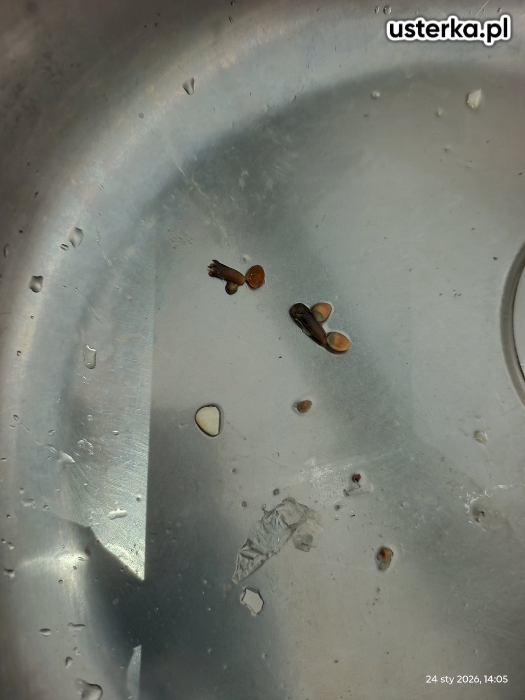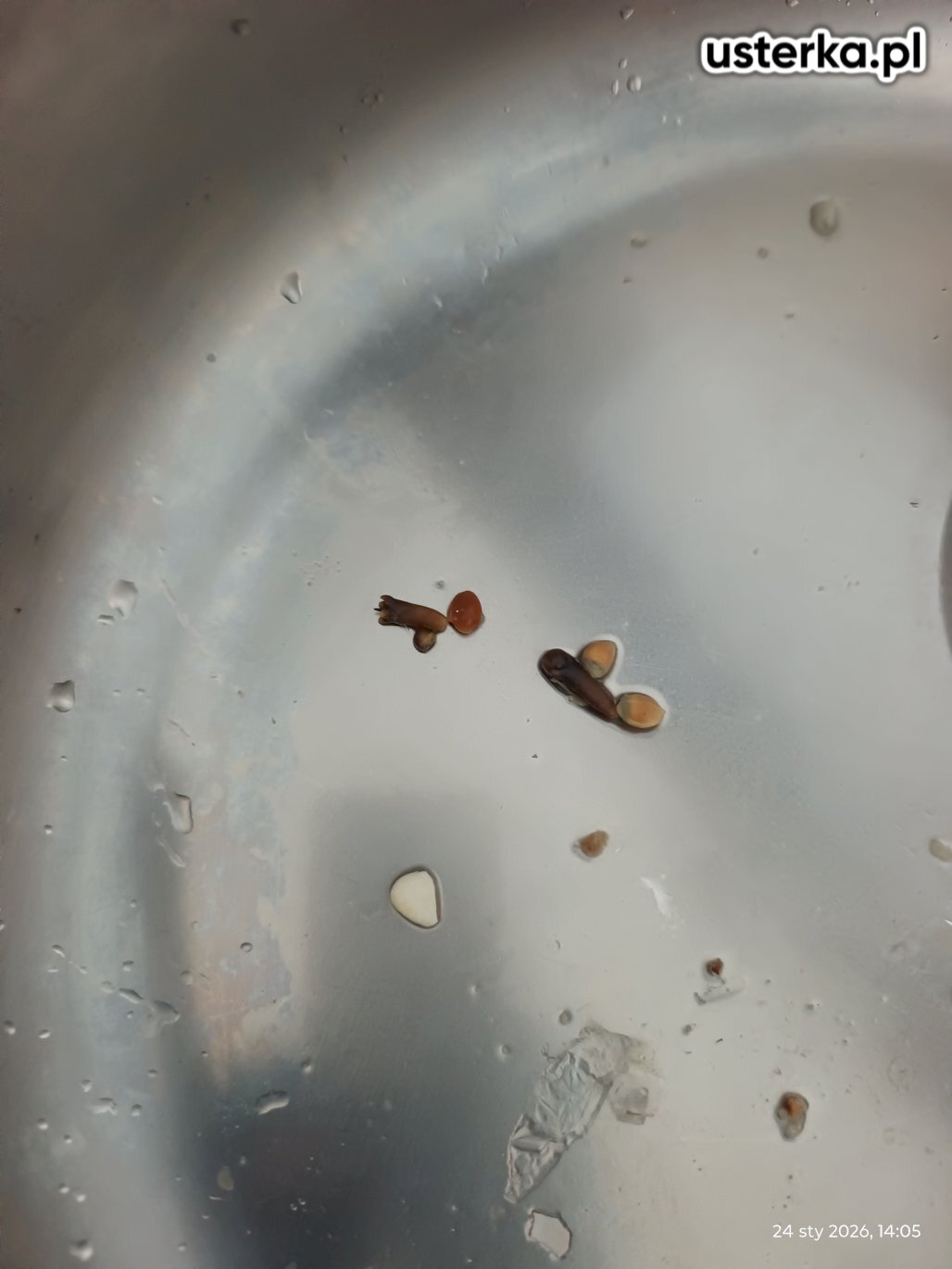 Oczyszczono pompę odpływową z pestek i fragmentów plastiku. Zmywarka działa prawidłowo.