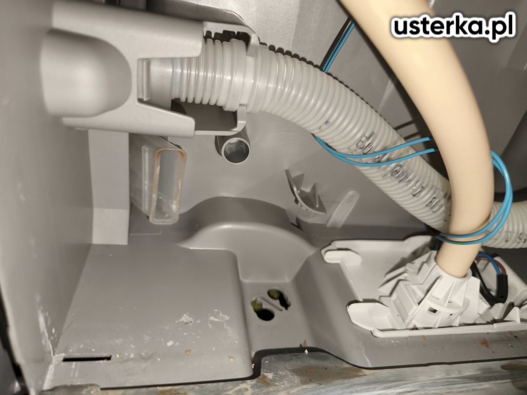 Osuszyłem dno zmywarki, usunąłem pestki z pompy odpływowej i poprawiłem ułożenie węża odpływowego.