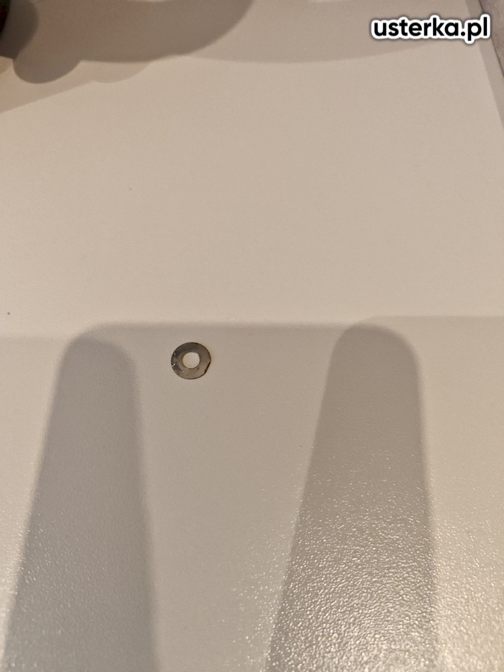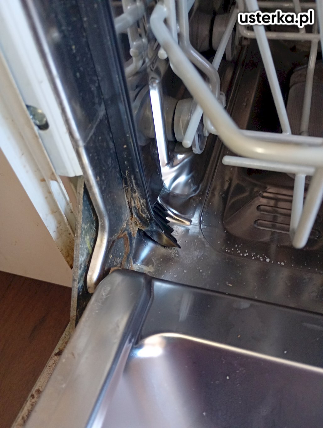 Uszkodzone drzwi zmywarki były wynikiem oparcia się o otwarte drzwi. Naprawa polegała na dogięciu blachy wewnętrznej z zawiasami.
