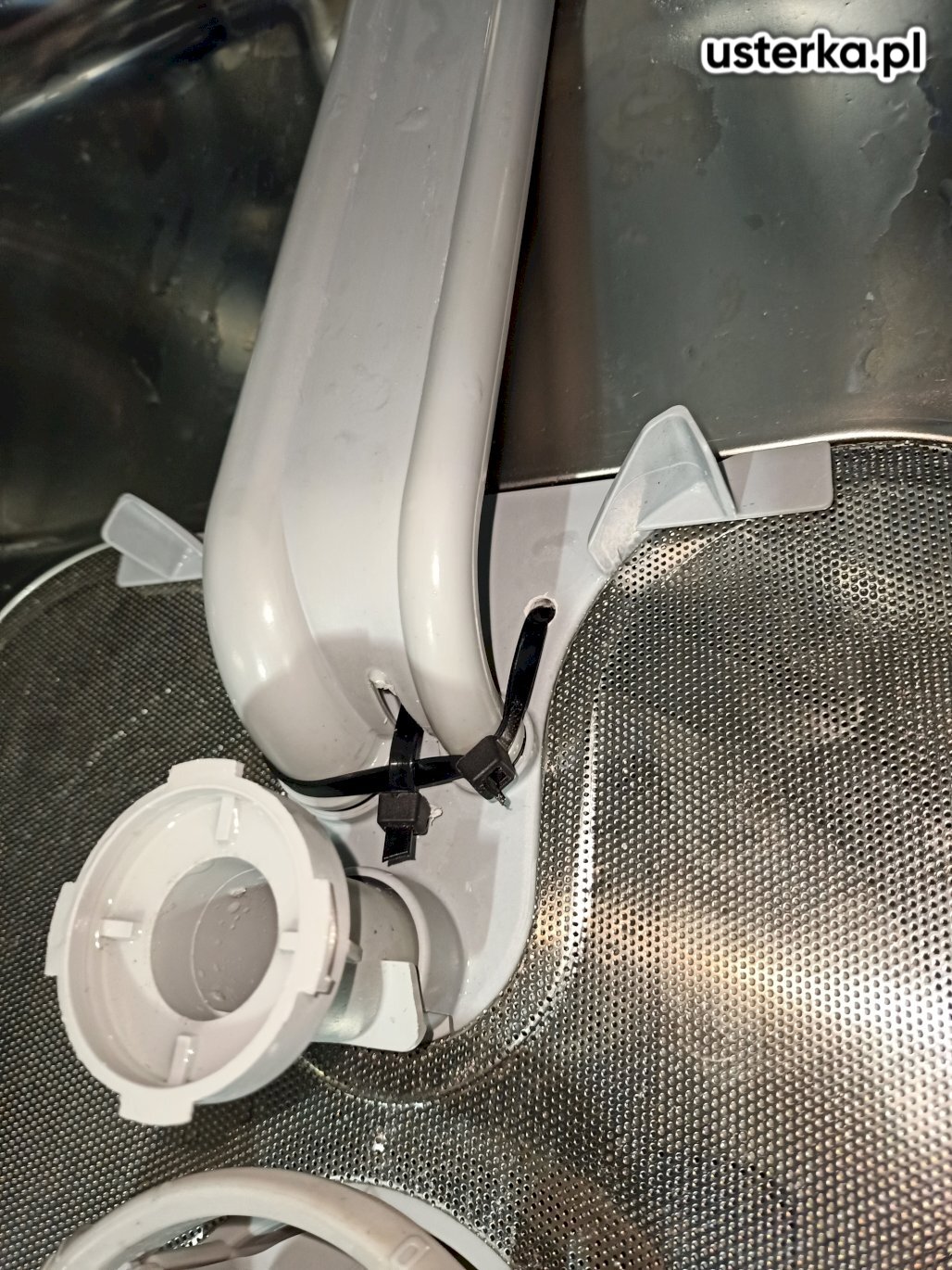 W zmywarce Whirlpool przyczyną problemu z ciśnieniem były zużyte zatrzaski górnego ramienia spryskiwacza. Zamontowano opaskę zaciskową.