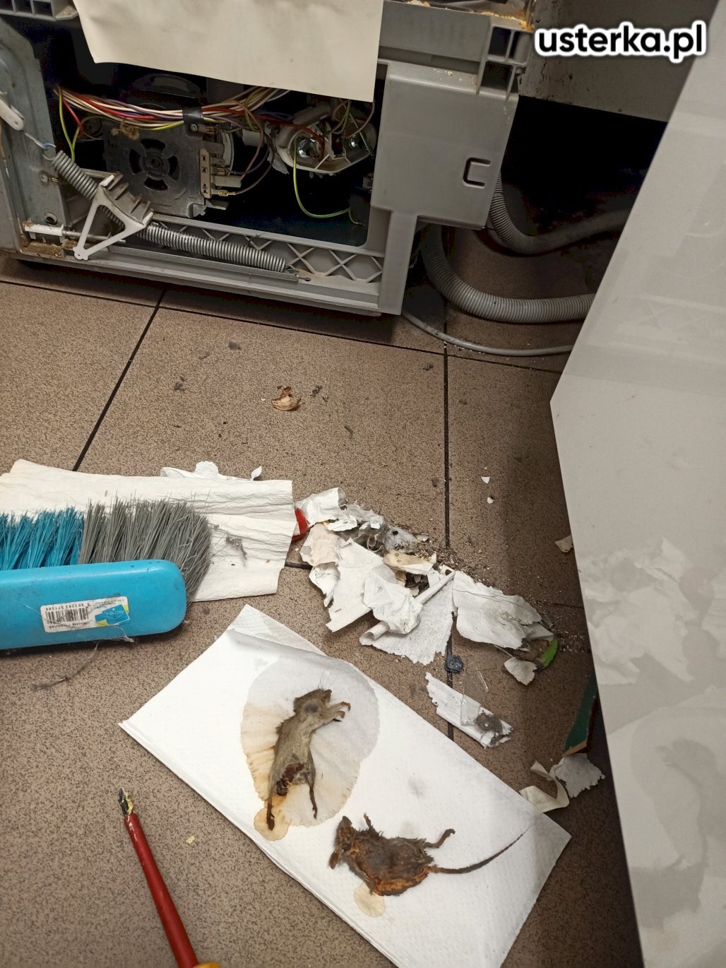 Zmywarka Bosch, 20-letnia. Wewnątrz ślady obecności myszy, sprawdzone węże, widoczne zacieki na obudowie.
