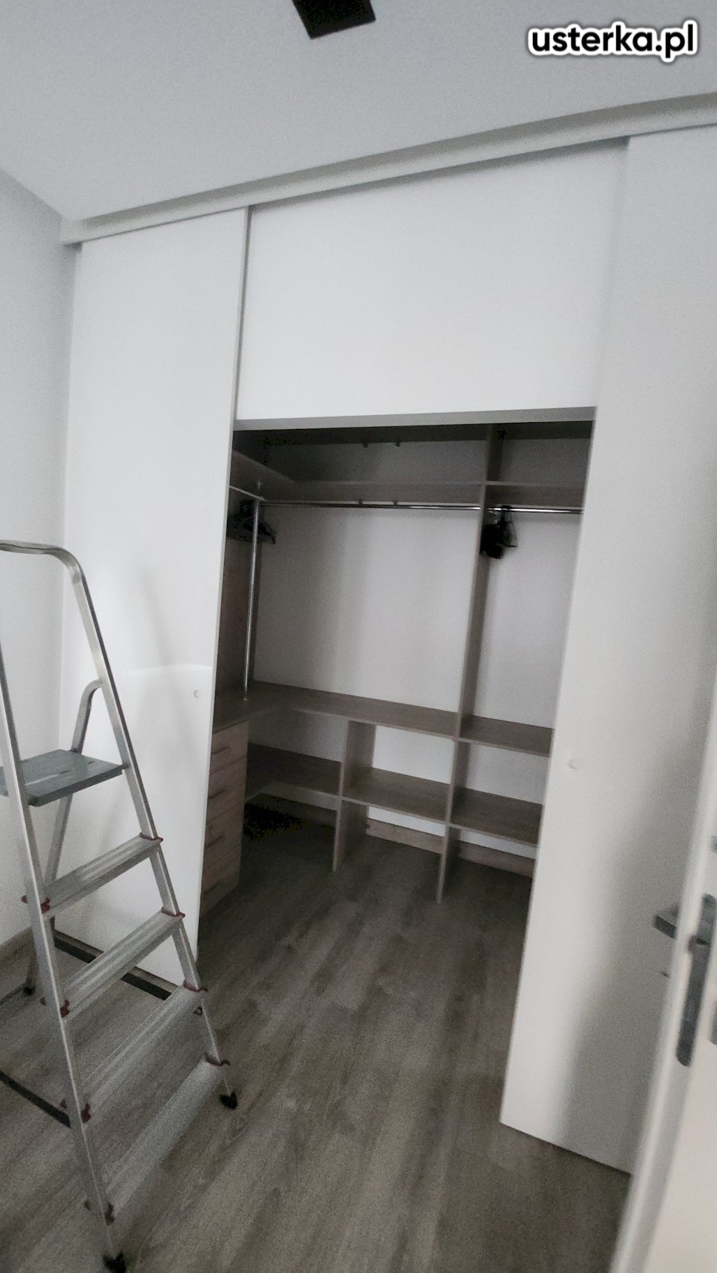 Zlecenie obejmowało ponowny montaż drzwi szafy przesuwnej, które wypadły z prowadnic. Po zamontowaniu i wyregulowaniu drzwi wszystko działa prawidłowo. Dodatkowo zamontowałem dwa metalowe uchwyty do karniszy oraz podkleiłem taboret.