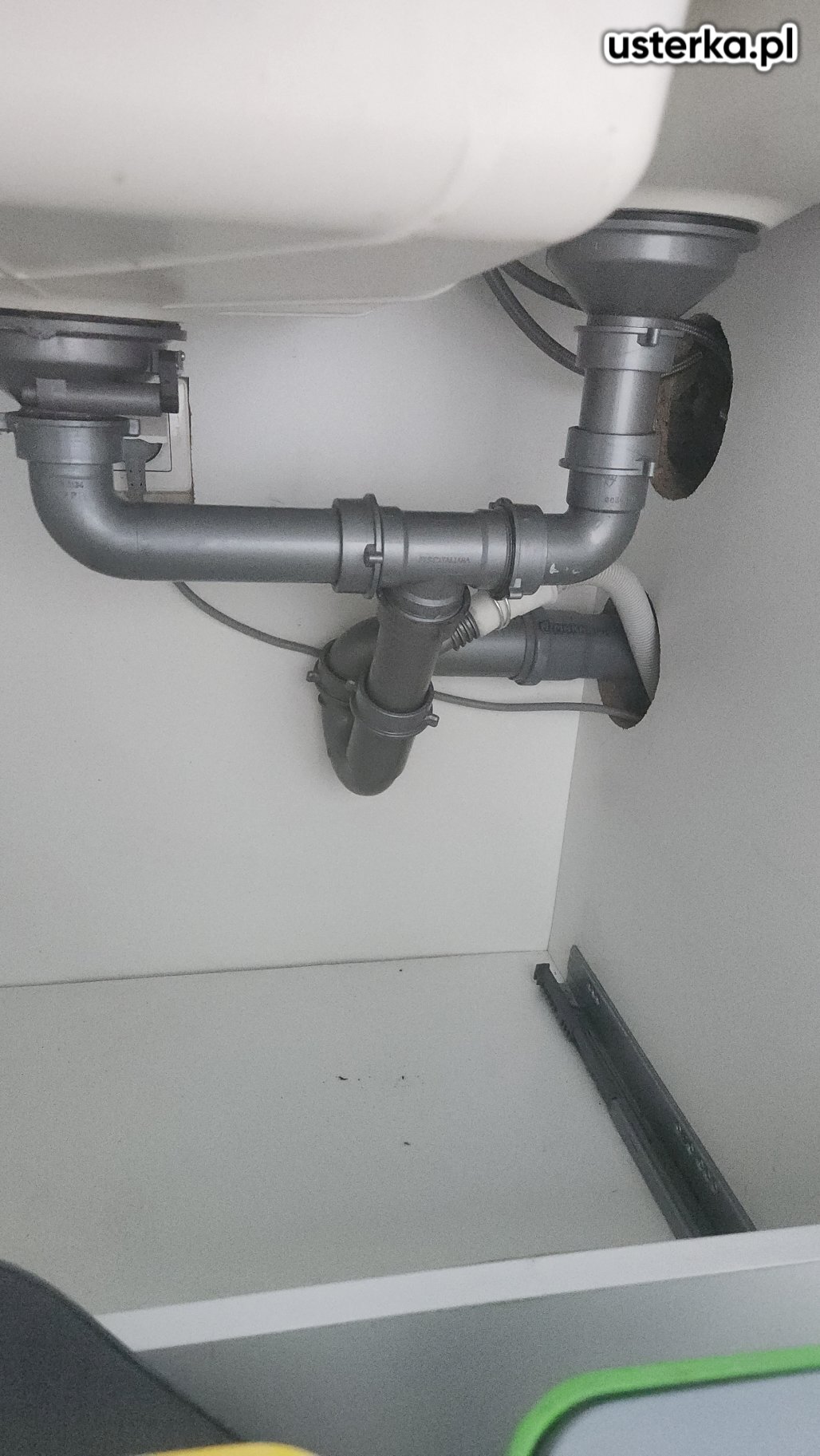 Usunięcie nieszczelności syfonu i baterii kuchennej, regulacja drzwi przesuwnych oraz silikonowanie szczeliny między blatem a ścianą.